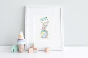 A children's wall art set of a cute elephant having lots of fun at the circus. Join this adorable baby elephant as he floats high with a bright pastel bunch of balloons artwork, balances on a bright pastel painted ball, and bangs his watercolour drum. This set of kid's nursery prints is perfect for a circus theme baby girl or boy's bedroom or bold child's room decor.