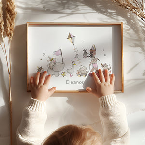 Our team carefully stitches and adds 3D collaged paper flags to some of our prints. An intricate yet valuable stage in our process to not only replicate Jessica’s characterful original illustrations, but to bring your child unique details that spark their imagination. All our prints can be personalised with a baby's name, date or special message, and many prints also have colour and character customisation options too. Allowing you to create a truley unique and personal children's gift.