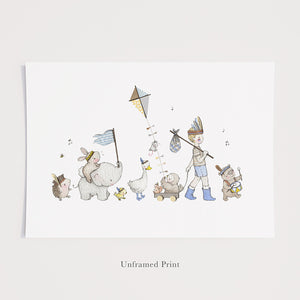Customise this adventurous kid's picture with a child's name, date of birth and choice of boy or girl character to create a unique gift for a newborn baby, Christening or baby shower present. Featuring an elephant, rabbit, bear and their woodland animal friends heading off on an exciting expedition, this imaginative kid's print would suit a classic baby boy's bedroom or girl's nursery wall.