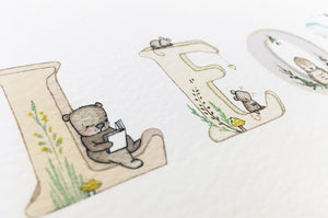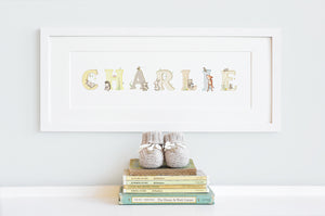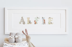 This personalised children's woodland name art print is the perfect gift for a child's chirstening, newborn baby, naming ceremony or birthday. Featuring a child's name in painted watercolour alphabet letters with cute illustrated woodland animals, this framed name picture would look wonderful in a gender neutral baby nursery, or child's woodland theme bedroom. Add extra names, date and special message to be printed underneath the illustrated child's name, for a truly personal baby gift.