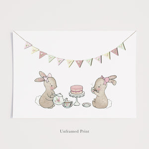 A pretty girl's bunny picture or two cute rabbits having an English afternoon tea party, perfect for a newborn baby girl, christening or baby shower gift. Customise this classic children's pink bunny painting with a personalised child's name and date of birth above the illustrated paper bunting, for a unique personal baby girl gift.