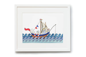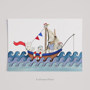 This personalised children's boat at sea picture would make a thoughtful gift for a baby boy or baby girl. With a child's name printed in the sea and a custom date in the flag, this nautical themed kid's print is perfect for a newborn, christening, first birthday or baby shower present. Choose from five child characters to sail the seas with their ocean animal friends in this fun adventurous kid's wall art picture.