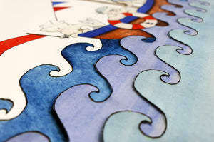 Our team carefully stitches and adds 3D collaged paper flags to some of our prints. An intricate yet valuable stage in our process to not only replicate Jessica’s characterful original illustrations, but to bring your child unique details that spark their imagination. All our prints can be personalised with a baby's name, date or special message, and many prints also have colour and character customisation options too. Allowing you to create a truley unique and personal children's gift.