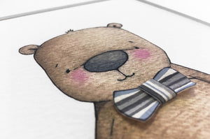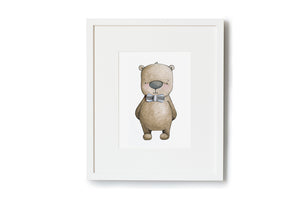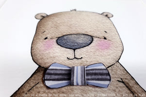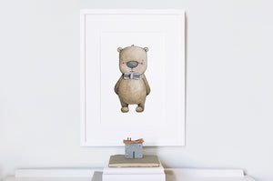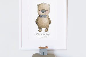 This classic children's bear picture would make a unique gift for a baby boy. Add a child's name and date underneath the cute bear illustration to create a personal gift for a newborn, Christening or baby shower. The pastel, powder blue and beige colours of this children's bear print makes it a wonderful wall picture for a baby boy's traditional nursery decor.