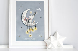 This personalised children's picture of a crescent moon illustration would look wonderful in a baby boy, baby girl or gender neutral bedroom. Customise this kid's lunar space theme print with a child's name in the night sky and additional birth details printed underneath the moon for a thoughtful new baby, christening or baby shower gift.