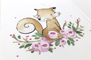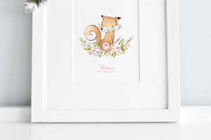 This pretty floral fox nursery print features a beautiful wreath of watercolour painted flowers in soft pastel pink shades around a sweet baby fox, perfect for a girl's woodland bedroom interior. The option to personalise with a name, date of birth or special message makes this picture an ideal gift for a baby girl. Available in three different print sizes and we can add a white wooden picture frame so that it is ready to hang on a nursery or playroom wall.
