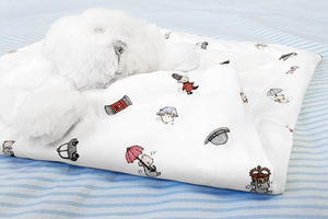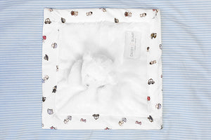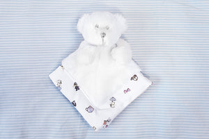 This baby boy's London bear comforter toy is the perfect gift for a baby shower, christening or newborn baby boy. This sweet baby bear comforter is handmade in England, lined with Daisy & Bump's cute British Mice illustrated print and super soft and cuddly! We can also gift wrap this comforter with a gift message for a unique baby boy gift.