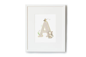 Available in three print sizes, this children's alphabet letter artwork also has an option to add a white wooden picture frame, perfect for hanging in a gender-neutral baby nursery or child's woodland theme bedroom.