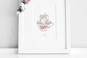 This personalised children's picture of a cute mouse in a vintage china tea cup, would make a unique gift for a newborn baby, christening or girl's first birthday, with a child's name and date printed under the illustration. With pretty pink florals and English tea theme, this watercolour picture is perfect for a traditional theme girl's bedroom or pink baby nursery.