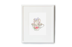 Printed on thick archival paper with pigment inks, this girl's tea cup wall picture is available in three print sizes with the option to add a white wooden frame. It can also be gift wrapped in our bespoke animal wrapping paper, with a twine bow and gift message written on a silver embossed mouse gift tag.