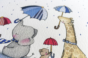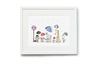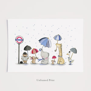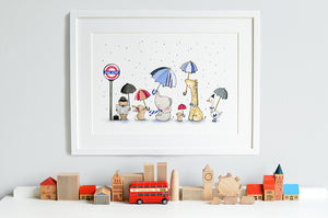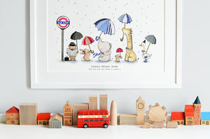 A British themed, customisable nursery art print of elephants, giraffes, bears and many more animals waiting in line at the bus stop for a rainy day at London Zoo. This children's London picture would make a unique personal newborn, Christening, first birthday gift, and a bold addition to any British theme kid's bedroom.