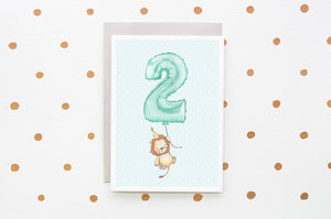 A boy's second birthday card, with a cute lion character with a green number 2 balloon, this greetings card is the perfect way to say happy 2nd birthday to a special little boy. Blank inside, this boy's greetings card is perfect for writing your own special birthday message, party invite or thank you note. This children's luxury greetings card is printed on beautiful high quality smooth card, and presented in a cellophane sleeve with a grey envelope. If you are sending this card directly to the lucky recipient we can also hand-write a gift message inside on your behalf, simply enter your message in the box above. (Leave this box blank if you wish to hand-write your message inside yourself).
