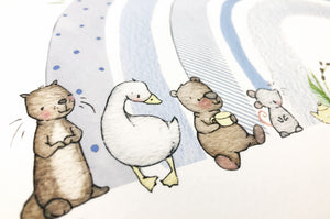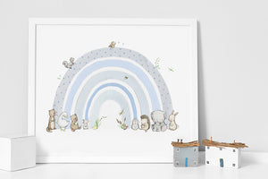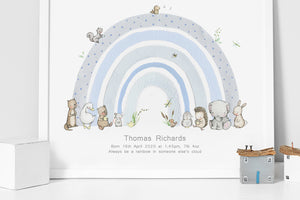 Add a personalised name and date underneath this children's blue rainbow picture to create the perfect present for a newborn baby boy, baby shower, christening or first birthday gift. Featuring cute watercolour animals, this illustrated kid's print would make a wonderful wall decoration for a boy's bedroom, nursery or playroom.