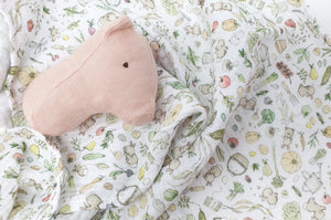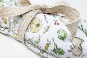 About: A super soft muslin cloth is an essential baby item, great during feeds, for winding newborns, and wiping up spills, this absorbent 100% cotton muslin square is gentle on baby's skin, and printed with Daisy & Bump's unique illustrated bunny in allotment vegetable patch design, it's oh so cute!