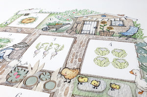 Boys and girls will love counting the illustrated vegetables and fruit in this children's count to ten watercolour painting of a garden allotment. Spot the cute bunny rabbits, mice and birds hidden amongst the botanical patterns. Add a child's name and date to create a unique personalised baby gift for boy or girl. This allotment picture would make a wonderful present to or from an avid gardener parent, grandparent, family member or friend.