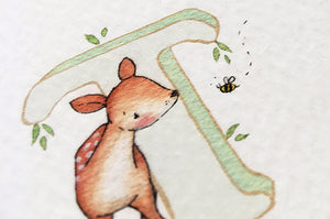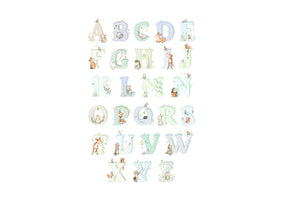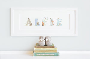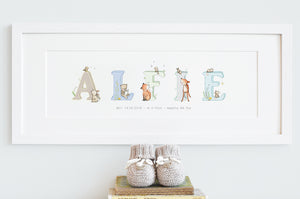 This whimsical blue and green woodland theme name art print features rabbits, mice, foxes, squirrels, deer, badgers and bears. A special personalised gift for a new baby boy, christening or boy’s first birthday, this stunning wall decoration will be treasured for many years to come.
