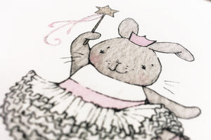 A set of four girl's nursery wall art prints of four dancing ballerina bunny rabbits, wearing pink and white tutus with floral details, perfect for a girl's pink bedroom decor. Available in three print sizes with the options to add white wooden picture frames, this classic girl's artwork set would be a wonderful gift to decorate the bedroom of an aspiring little ballet dancer.