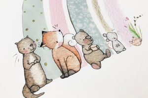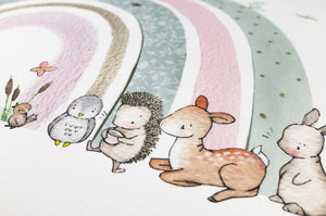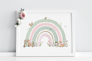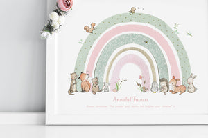 Add a personalised girl's name and date under this pretty pink and green floral rainbow picture to create the perfect gift for a newborn, baby shower, girl's christening or first birthday gift. Featuring cute woodland animals, this whimsical kid's print would make a delicate bright wall decoration for a girl's bedroom, nursery or playroom.