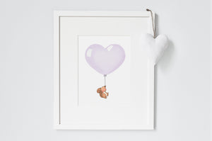 This pretty girl's nursery picture of a baby squirrel holding a pastel lavender heart shaped balloon can be personalised with a child's name and birthdate under the illustration to create a personal newborn, baby shower or christening gift. Customise the balloon colour and animal character of this kid's print to match a nursery colour scheme or child's bedroom decor theme. There are two different print sizes available and an option to have your artwork professionally framed in a white wooden picture frame.