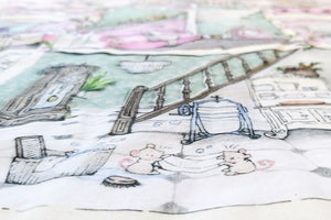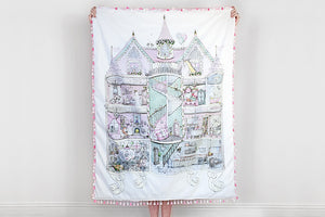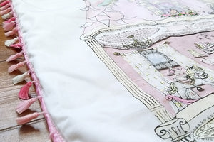 This girl's play mat, featuring Daisy & Bump's Princes Palace Illustration is perfect for a baby girl's nursery, children's bedroom or kid's playroom decor. Handmade with 100% cotton in our studio, with pink tassel trim, this British made large child's playmat is like a big soft nursery rug, adding style to your child's floor, but also providing a perfect soft space for baby's tummy time, or for a child to comfortably play and read. The cut away dolls house style painting, features many rooms, animals and intricate princess castle details, sure to spark your child's imagination, and would make a truly unique girl's gift.