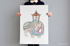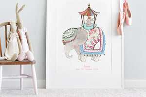 A big boho style children's illustration for a girl's nursery or princess theme child's bedroom or a royal Indian elephant. This eclectic girl's watercolour illustration of a bohemian patterned large elephant with his rabbit friend, would look beautiful hung above a baby girl's cot, bed or changing table for an impressive focal point in the room. Add a personalised child's name and date under the elephant painting for a personal unique girl's picture or baby gift.