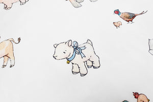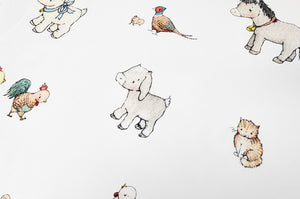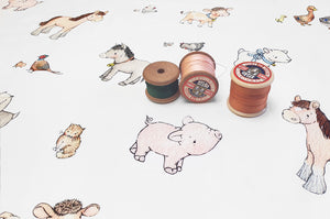 Children's farm animals fabric sold by the meter, perfect for making baby nursery curtains, children's bedding, infant clothing, kid's interior accessories, and many more fun craft projects. This 100% cotton fabric features an horse, cow, lamb and many more cute farm animals, suitable for use in small upholstery projects and soft nursery furnishings, perfect for a gender neutral farm theme kid's bedroom.