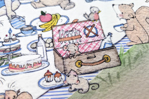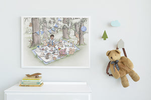 This big children's print of woodland animal friends enjoying a picnic in the forest, is perfect for a baby boy traditional style nursery or a classic child's bedroom wall. Choose from four boy characters and personalise this kid's picture with a child's name and date in the corner of the illustration, to create a truly unique children's wall print.