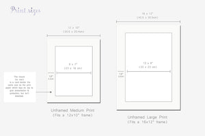 Sizes - All options come with an acid free textured mount. Unframed prints are presented flat in a cellophane sleeve with a backing board. See size chart in product photos of visit our FAQ page for more helpful info on sizing & framing.