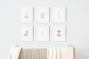 This cute children's farm animals wall art print set would be the perfect decor for a baby boy, baby girl or gender neutral nursery or kid's farm theme bedroom. Featuring six farm animal illustrations, a lamb, pig, duck, horse, chick and highland cow, this children's nursery print set is available in three print sizes and white or oak wooden picture framing can be added too. This cute set of children's farm animal pictures would look lovely hanging above a baby's cot or changing area, and is sure to become the feature art piece in any little boy or girl's nursery interior design.