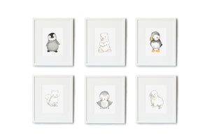 This set of six children's animal wall art prints features a newborn polar bear, penguin, puffin, arctic fox, snowy owl and baby seal, from the north and south pole. Minimal and modern, this gender-neutral polar animal print set is perfect for a unisex nursery, nautical or ocean inspired kid's bedroom.