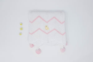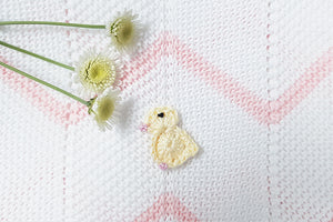 This baby girl's pastel pink three little ducks knitted blanket, is a thoughtful gift for a newborn girl, baby shower or christening present. With cute pink and yellow duckling crochet detail, pom pom corner trim and modern chevron design, this 100% cotton knit infant shawl, is a wonderfully soft receiving blanket to wrap and swaddle a newborn baby girl in.