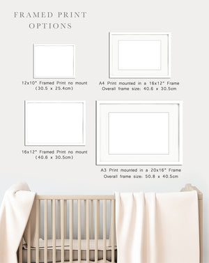Printed with pigment inks onto thick textured archival paper, this children's giclee art print can be professionally framed in a wood frame (available in oak or with a white paint finish). Professionally tape sealed back, with picture cord attached and safety perspex, our frames arrive ready to hang! Please see the product photos for all the print size and frame options.