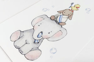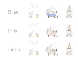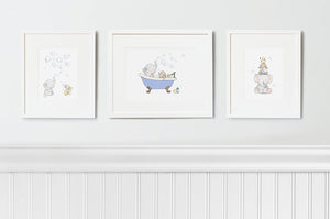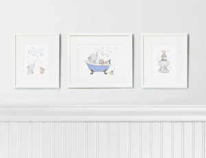 This cute children's bathroom set of three wall art prints set features three baby animals having fun in the bath tub with lots of bubbles. Available framed or unframed, with a choice of colour schemes.