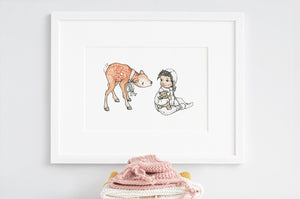 This sweet unique watercolour painting illustration of a baby meeting a newborn deer fawn would make a cute gift for a newborn baby, mum to be or christening gift. This classic style children's illustrated print can be personalised with a child's name, date and message underneath the painting, for a unique personal kids gift.
