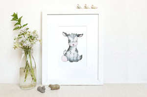 Printed with pigment inks on acid-free textured archival paper, this high quality children's Fine Art baby goat animal print can also be gift wrapped in our bespoke animal gift wrap paper (select during checkout), with a striped twine bow, and we can include a gift message too on a silver embossed mouse card gift tag.