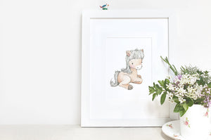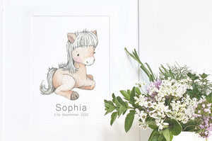 This cute children's personalised animal print of a cute baby horse illustration would make a thoughtful gift for a newborn, baby shower, birthday or baptism. Perfect for a baby boy, baby girl or gender neutral nursery, this adorable illustrated newborn foal picture would look wonderful on a baby's farm themed nursery wall or kid's bedroom shelf. Available in many print sizes, with the option to add a white or oak wooden picture frame, this children's print can be personalised with a printed child's name and date under the artwork.