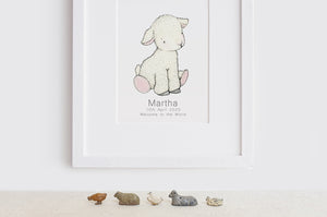 This cute children's personalised animal print of a cute baby lamb illustration would make a thoughtful gift for a newborn, baby shower, birthday or baptism. Perfect for a baby boy, baby girl or gender neutral nursery, this adorable newborn baby sheep picture would look wonderful on a baby's farm themed nursery wall or kid's bedroom shelf. Available in three print sizes, with the option to add a white wooden picture frame, this children's print can be personalised with a printed child's name and date under the artwork.