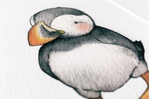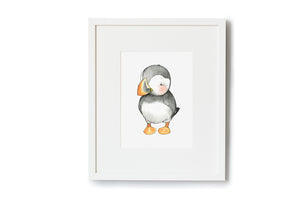 A cute personalised children's picture of a newborn baby puffin bird, a perfect gift for a new baby, christening or kid's birthday. Available in many print sizes, with the option to add a white or oak wooden picture frame, this polar theme kids print can also be customised with a child's name and birth details under the puffin illustration. Perfect for a baby boy, baby girl or gender neutral nautical nursery decor theme.