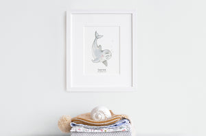 A cute personalised children's picture of a newborn baby dolphin, a perfect gift for a new baby, christening or kid's birthday. Available in three print sizes, with the option to add a white wooden picture frame, this print can also be customised with a child's name and birth details under the dolphin watercolour illustration. Perfect for a baby boy, baby girl or gender neutral nautical nursery decor theme. This ocean themed kid's painting is printed on high quality paper, and can also be gift wrapped in our bespoke animal gift wrap paper for the perfect new baby gift.