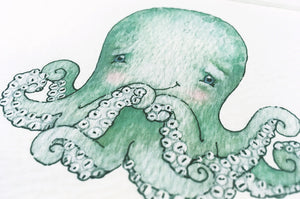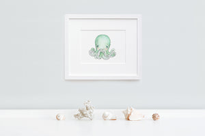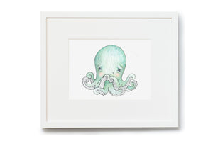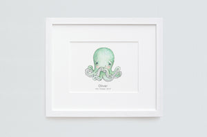 A kid's print of a cute baby octopus, perfect for an ocean themed baby's nursery or child's nautical bedroom. Add a child's name and date under the illustration to create an unusual personal gift for a newborn, Christening or baby shower. With his eight tentacles this newborn baby octopus is printed on thick fine art archival paper and is available unframed or framed in a white wooden picture frame.