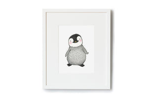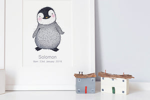 A cute personalised children's picture of a newborn baby penguin, a perfect gift for a new baby, christening or kid's birthday. Available in three print sizes, with the option to add a white wooden picture frame, this print can also be customised with a child's name and birth details under the penguin illustration. Perfect for a baby boy, baby girl or gender neutral nautical nursery decor theme.