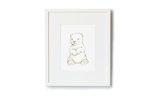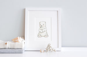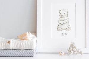 A cute personalised children's picture of a newborn polar bear, a perfect gift for a new baby, christening or kid's birthday. Available in three print sizes, with the option to add a white wooden picture frame, this print can also be customised with a child's name and birth details under the bear illustration. Perfect for a baby boy, baby girl or gender neutral arctic nursery decor theme. T