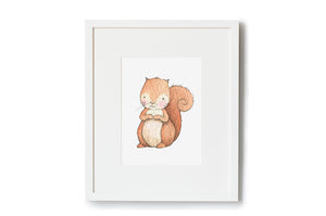 This gender-neutral nursery picture of a cute newborn baby squirrel can be personalised with a child's name and birthdate under the illustration to create a personal newborn, baby shower or christening gift. There are three different print sizes available and an option to have your artwork professionally framed in a white wooden picture frame, perfect for a unisex baby nursery or woodland theme children's bedroom.