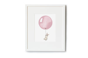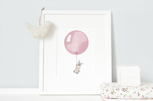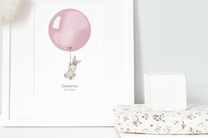 This pretty girl's nursery picture of a baby bunny rabbit with a dusty pink round balloon can be personalised with a child's name and birthdate under the illustration to create a personal newborn, baby shower or christening gift. Customise the balloon colour and animal character of this kid's print to match a nursery colour scheme or child's bedroom decor theme.