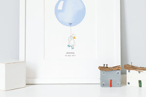 A classic, personalised boy's powder blue colour balloon painting which can be customised with a choice of character, including a duck, elephant, bear and many more animals. Add a child's name and birth date under the illustration for a thoughtful newborn baby or first birthday gift. This boy’s bedroom wall art is a timeless art piece, printed on fine art paper with high quality ink, to create a timeless children's print that will last for many years.