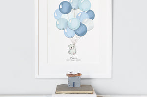 This bold children's balloon picture of a polar bear floating with a bunch of blue balloons would be a perfect gift for a newborn, baby shower, or first birthday gift. Personalise this children's print with a choice of animal character, and a child's name and date of birth printed underneath the illustration for a unique kid's picture. There are two print sizes available and an option to have your picture professionally framed in a white wooden frame, perfect for decorating a child's nautical theme nursery, bedroom or kid's playroom.