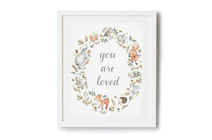 A children's inspirational quote wreath picture, with deer, rabbits, a fox and many more forest animals, is available with the printed quote "you are loved" or alternatively, personalise this print with a child's name, date or special message in the centre of the woodland wreath to create a unique baby gift.