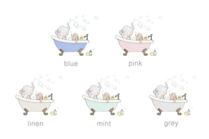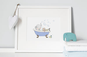This cute children’s giclee art print of an elephant, rabbit and chick in a soft powder blue bubble bath is a wonderful addition to a baby's nursery, kid's bedroom or child’s bathroom decor. Add a personalised child's name, date or special message under the artwork for a unique baby gift. Choose from two unframed print sizes, with the option to add a white wooden picture frame. We can also gift wrap this picture with our printed animal gift wrap paper, striped twine bow and gift tag.