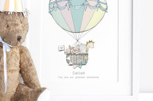 This personalised children's hot air balloon picture of a baby elephant, mouse, rabbit and giraffe floating in a big yellow and mint balloon, is a unique newborn, christening or first birthday gift. Personalise this children's print with a child's name and date of birth underneath the illustration for a unique kid's gift. There are two print sizes available and an option to have your picture professionally framed in a white wooden frame, perfect for decorating a gender neutral baby nursery, circus theme bedroom or kid's playroom.