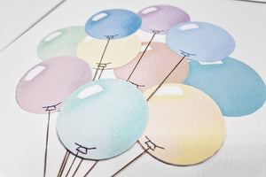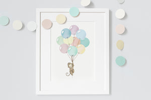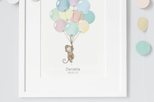 This bold children's pastel balloon picture of a monkey floating with a bunch of colourful balloons would be a perfect gift for a newborn, baby shower, or first birthday gift. Personalise this children's print with a choice of animal character, and a child's name and date of birth printed underneath the illustration for a unique kid's picture. There are two print sizes available and an option to have your picture professionally framed in a white wooden frame, perfect for decorating a child's circus theme nursery, bedroom or kid's playroom.